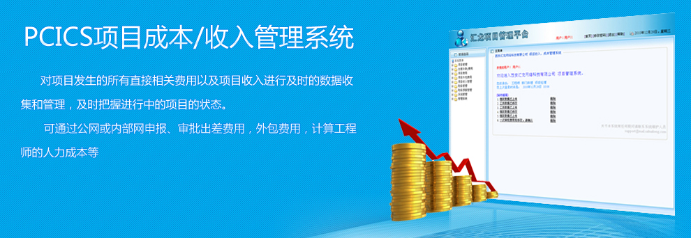 PCICS(Project Cost Income Control System)项目成本/收入管理系统。通过申报审核录入项目的各项成本费用和收入,统计项目成本及收入。外地工程师可以网络申报报销费用,财务部门据此进行审核及相关财务处理。适用于企业对项目成本和收入的管理。