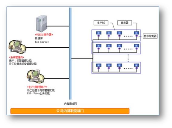 生产指导文件电子显示系统(WIEDS - Work Instruction Electronic Display System)将作业指导书直接显示在工位的显示屏上,替代传统的纸张。可显示内容包括作业指导书、工位操作视频等。各工位显示屏内容可以显示不同内容。每个显示屏配备一个android显示控制器。工位上可以通过遥控器进行翻页、暂停等动作。系统为B/S架构,可通过局域网内任何计算机的浏览器页面登录系统。